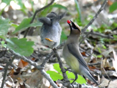 Members attending the RT Waterman Bird Club field trip to Lake Walton on 7.17.19 watched the parent Cedar Waxwings and the fledgling as they moved around just a few feet above ground in the dense growth near the trail.